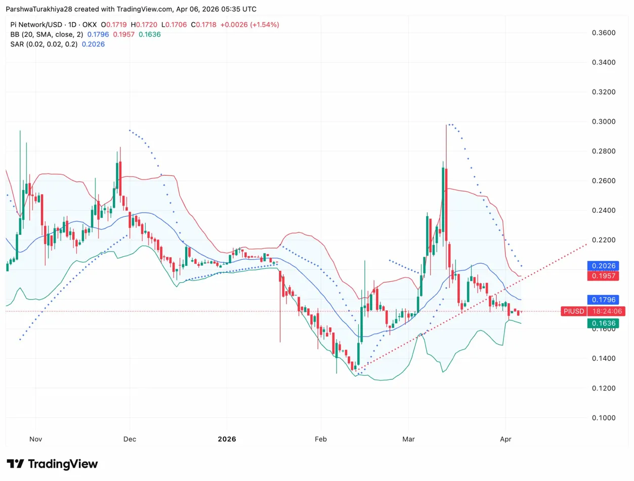 - PI trades at $0.1718, up 1.54%, pressing into the lower Bollinger Band at $0.1636 with the SAR at $0.2026 overhead.