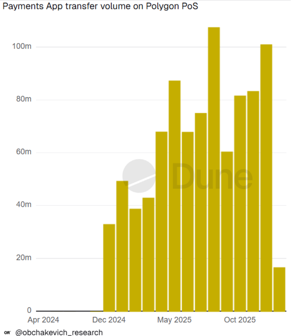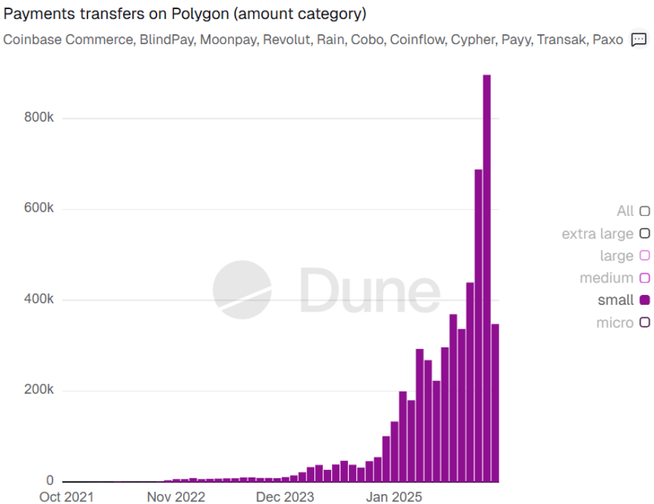 Leon Waidmann, the head of Onchain research, emphasized thatThis transaction range overlaps significantly with daily credit card spending, indicating that Polygon is gradually becoming a primary channel for payment gateways and PayFi (Payment Finance).