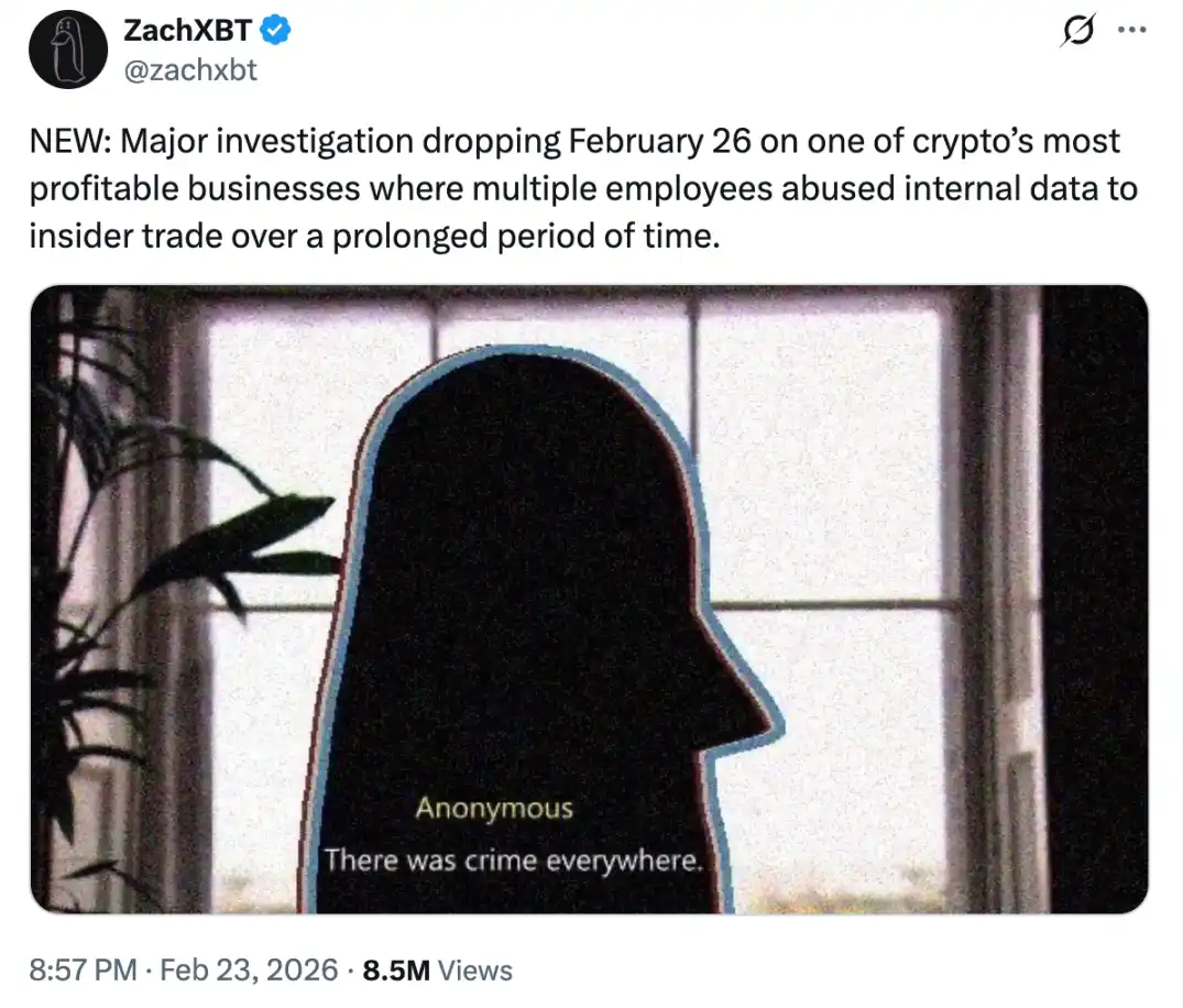 On the evening of February 23 Beijing Time, ZachXBT announced on X a major revelation: on February 26, he will disclose an investigation into one of the most profitable companies in the cryptocurrency industry, exposing long-term insider trading by its employees using internal data.
