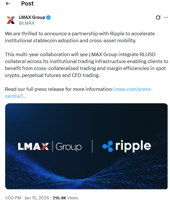 LMAX announced a partnership with Ripple in a blog post. It will integrate Ripple’s stablecoin RLUSD into its infrastructure. The move aims to accelerate institutional stablecoin adoption and cross-asset mobility. RLUSD will become a core collateral asset within the LMAX platform.