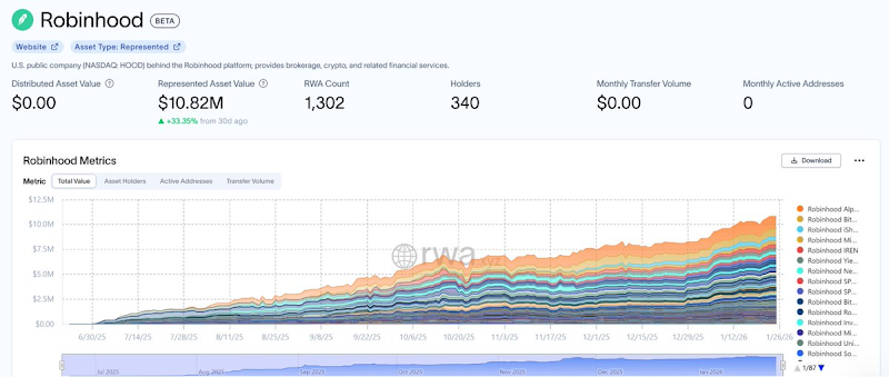 Robinhood's tokenized U.S. stocks and ETFs are now available to European customers. Each token is issued on the Arbitrum network, fully backed by stocks held by Robinhood, and enables 24/5 trading with zero commissions. Relevant data is available on RWA.xyz.