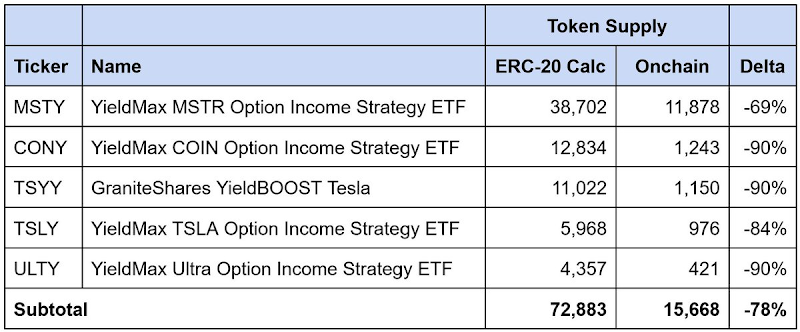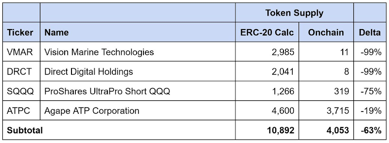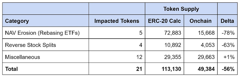 Among the 21 tokens we identified with data mismatches, the reported supply was overestimated by approximately 64,000 tokens, with discrepancies as high as 56%. High-yield ETFs accounted for about 90% of this gap, while reverse stock splits explained the remaining portion.