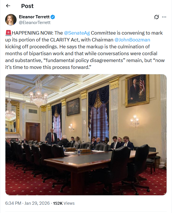 - The Senate Agriculture Committee voted 12-11 to approve the CLARITY Act, with no Democrats voting in favor.