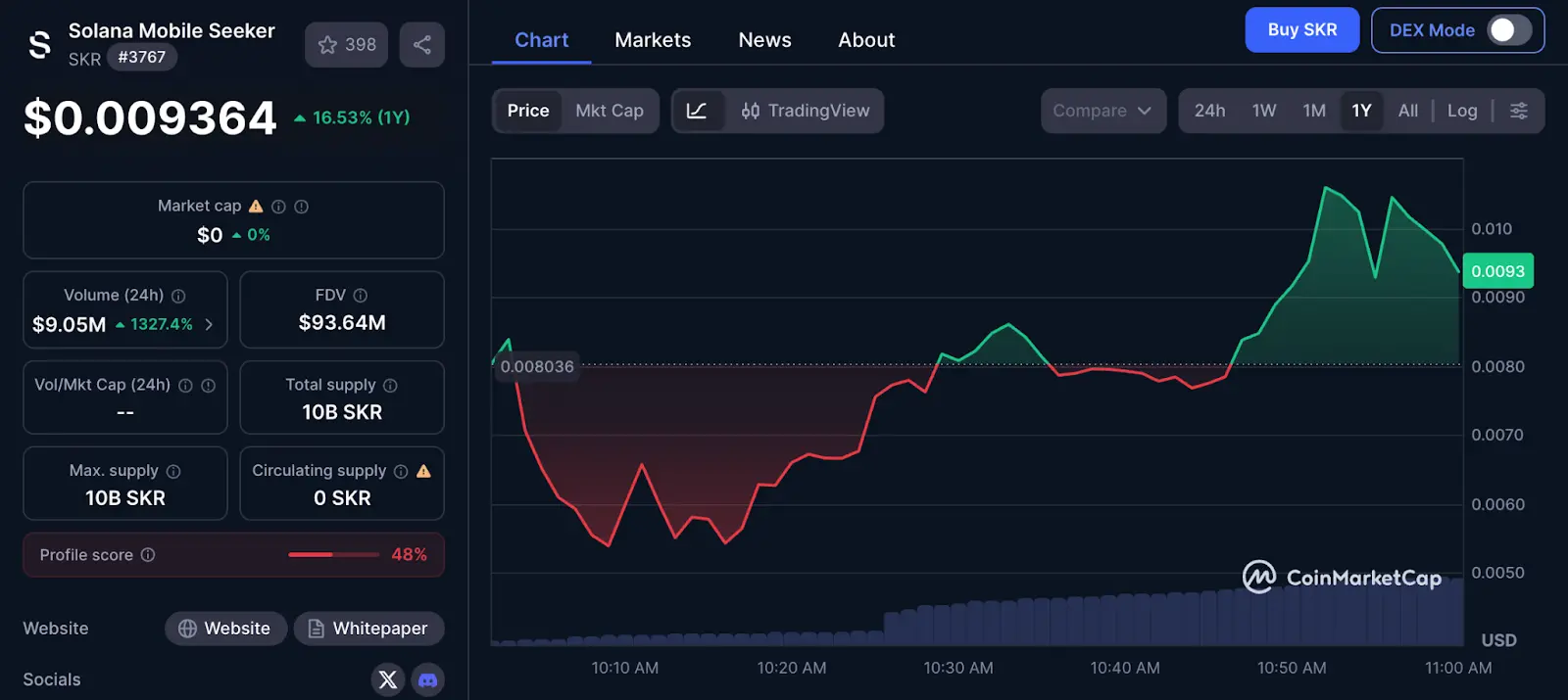 According to the data, the price of SKR fluctuated between $0.006 and $0.01 within the first hour of trading. At the current market price of approximately $0.0095 at the time of writing, the airdrop value for the lowest-tier Scout holders is $47.50, while the highest-tier Sovereign holders receive as much as $7,125. Compared to the pre-sale cost of the Seeker phone, which was approximately $450 to $500, this represents a maximum return of over 14 times the initial investment.