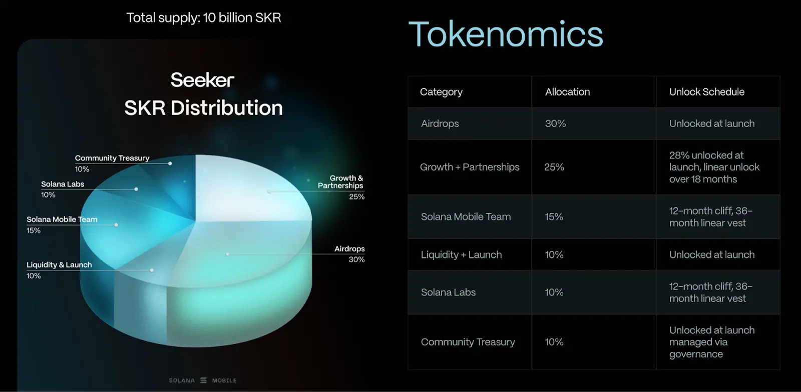 Token economics and lock-up periods are as follows: Airdrop allocation: 30% (unlocked immediately upon launch), Growth and Partnerships: 25% (28% unlocked at launch, with the remaining 18% unlocked linearly over 18 months), Team allocation: 15% (locked for the first year, then unlocked linearly over the next 36 months), Liquidity and Launch: 10% (unlocked immediately upon launch), Solana Labs: 10% (locked for the first year, then unlocked linearly over the next 36 months), and Community Treasury: 10% (unlocked immediately upon launch, managed by governance).