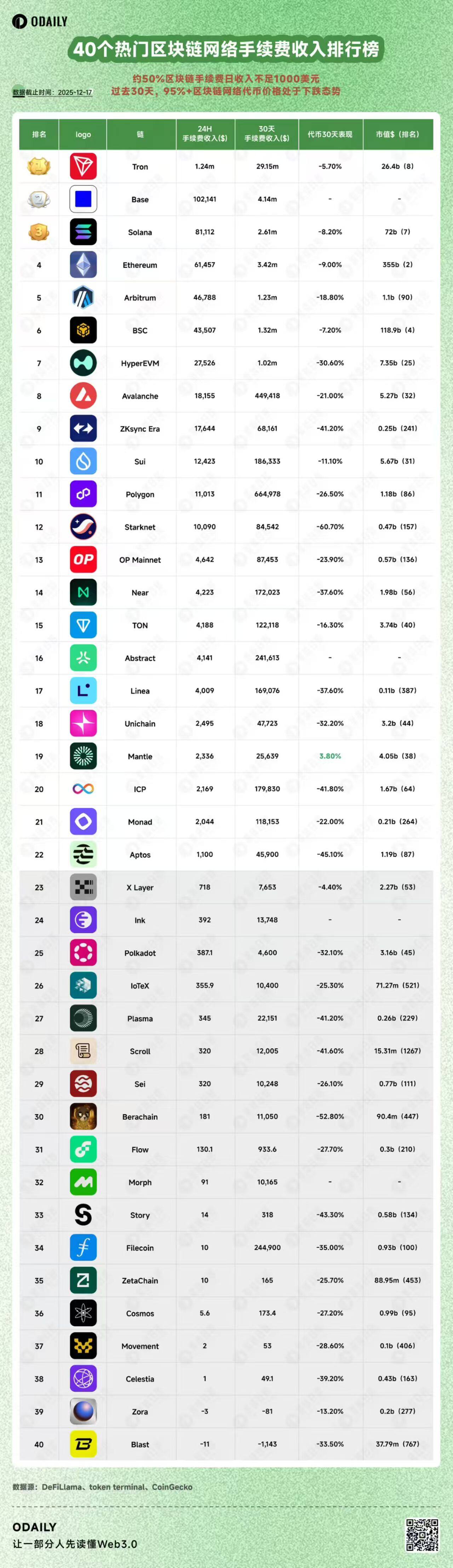 Odaily Planet Daily reported in mid-December on the transaction fee revenue rankings of 40 major blockchains. Starknet ranked within the top 15, with daily transaction fee revenue surpassing blockchains like Monad and TON.