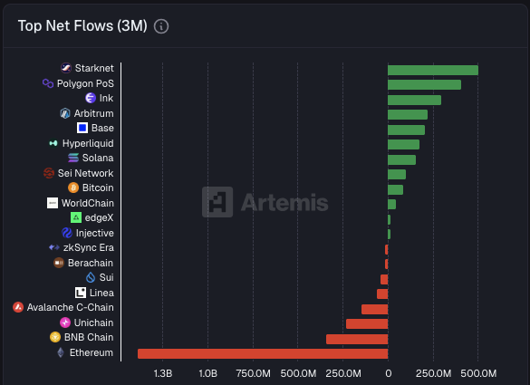 Don't simply view Starknet as a gathering place for niche enthusiasts in the blockchain space. In fact, Starknet has already gained favor from external capital and demonstrates strong user retention. According to Artemis data, Starknet recorded a net inflow of $504.2 million over three months, ranking first among all blockchains. The second-place blockchain, Polygon, is $100 million behind, while Starknet significantly outpaces other blockchains like Solana and BSC.
