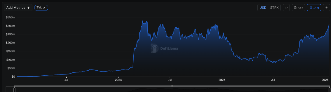After more than a year of hard work and determination, Starknet is now capable of competing with most L1s. According to DeFiLlama data, Starknet's TVL began to recover in September 2025 and has now exceeded $300 million, returning to the levels seen in 2024.Ranked 22nd in blockchain rankings, surpassing a number of L1 and L2 blockchains such as Monad, Scroll, Linea, and Sei.