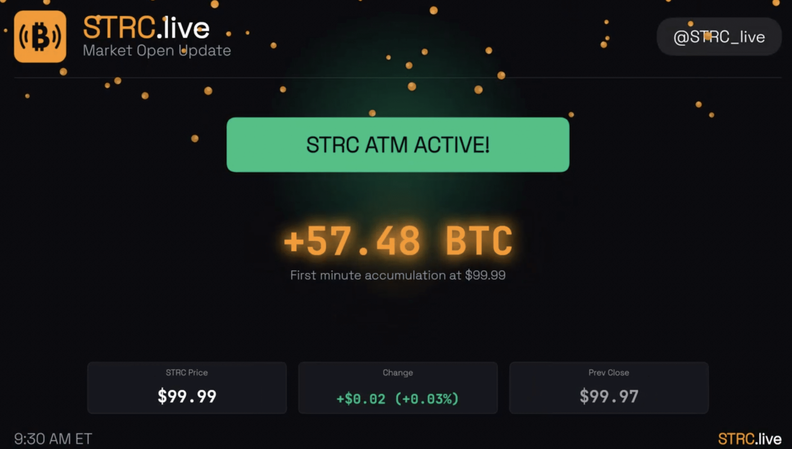 This comes as the Strive Digital Credit ETF (STRC) opened at $99.99 with 4000 shares in the first minute. Looking closer, 79,000 shares were issued through at‑the‑market (ATM) transactions during pre‑market hours. In fact, 57.48 BTC had already been stacked before the opening bell.