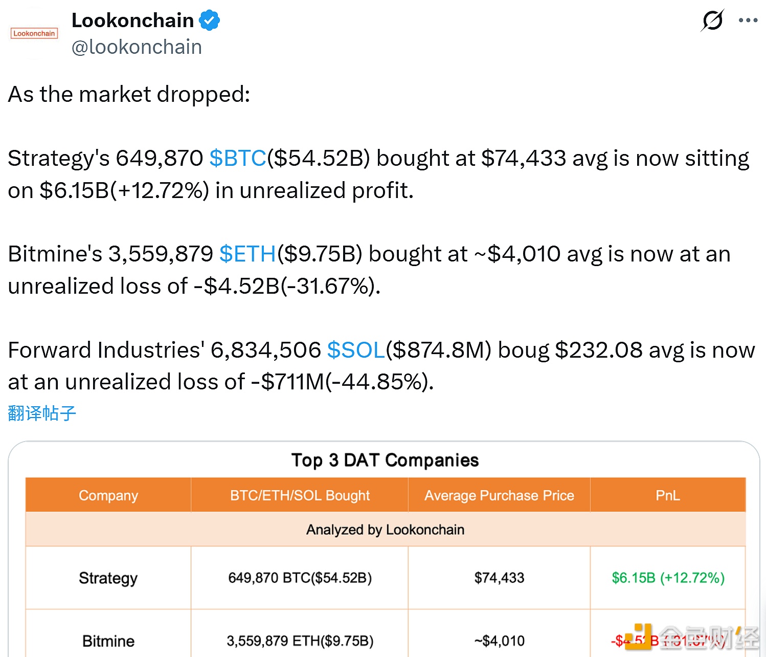 Forward Industries, the largest holding company of SOL, purchased 6,834,506 SOL tokens (worth $874.8 million) at an average price of $232.08, and currently has a paper loss of $711 million (44.85%).