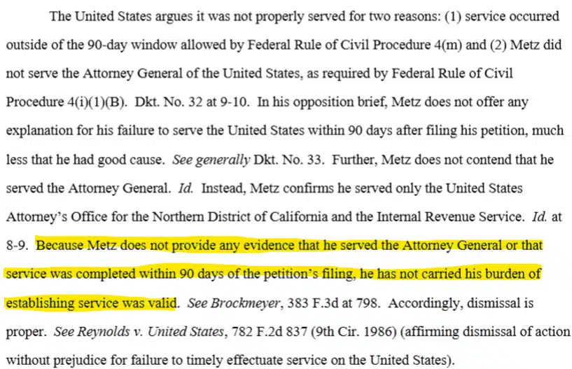 In the Metz’s case, apart from the IRS, the local district’s US Attorney, and the AG in Washington ought to have been notified within 90-days of filing the petition.