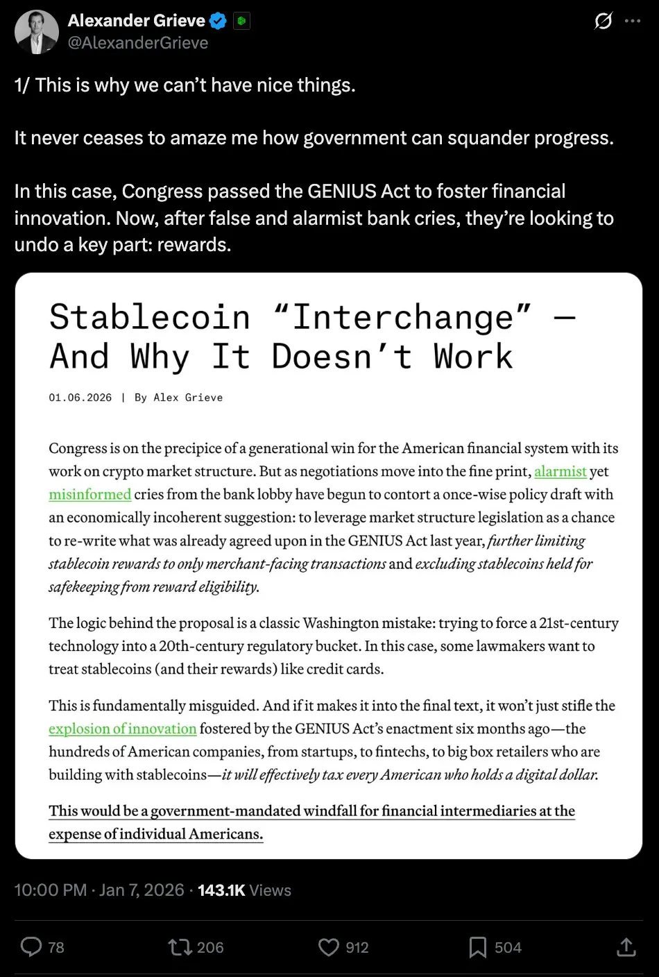 On the other hand, Alexander Grieve, Vice President of Government Affairs at Paradigm, characterized the banking industry's demands as "false and alarmist" political interference.He believes thatIf legislators are forced to amend the reward provisions in the "GENIUS Act," mandating that distributors withhold earnings, it would effectively amount to imposing a "hidden holding tax" on stablecoin holders, forcing middlemen to siphon profits that should rightfully belong to consumers. Grieve warned that such actions—sacrificing technological innovation to protect traditional financial profits—would severely weaken the international appeal of the U.S. stablecoin ecosystem, causing the United States to fall comprehensively behind in the competition for Web3 financial infrastructure.