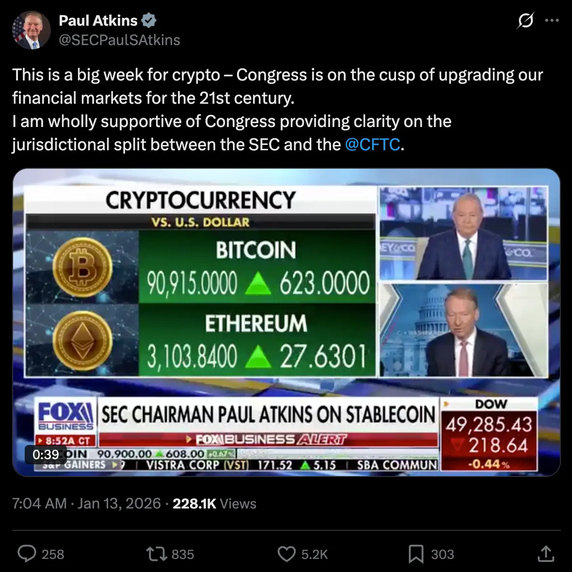 On January 13, SEC Chair Paul Atkins Post on X to emphasizeThis week marks a milestone for the cryptocurrency industry, as it publicly supports the Congress in clearly defining the jurisdictional boundaries between the SEC and the CFTC. This approach is clearly distinct from the previous chairman's heavily criticized "enforcement-style regulation." Atkins advocates for promoting a legislative framework, aiming to bring the crypto market out of regulatory gray areas.