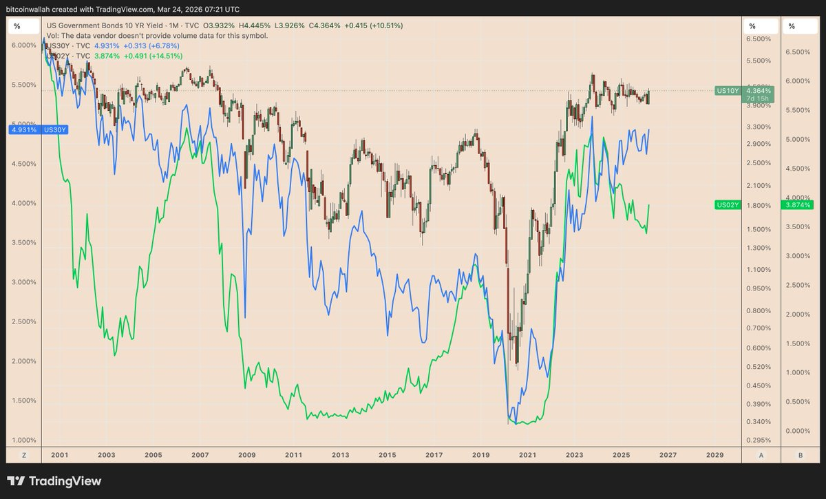 Monthly performance of U.S. 2-year, 10-year, and 30-year Treasury yields. Source: TradingView