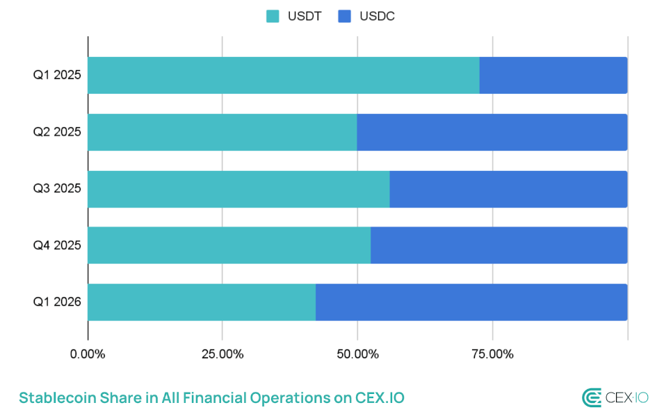 Circle’s USDC added roughly $2 billion in supply during the first quarter of 2026, pulling ahead of rival Tether at a moment when the broader crypto market was contracting. It marked the sharpest divergence between the two largest stablecoin issuers since the bear market of mid-2022.