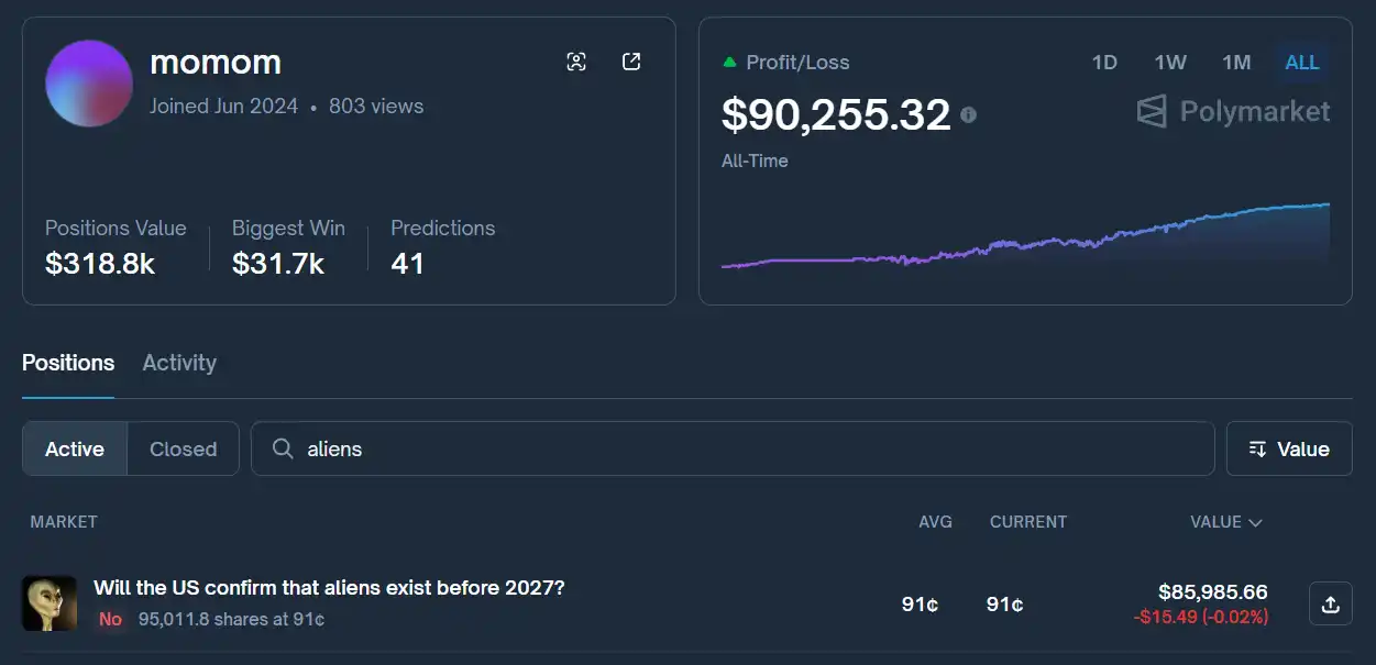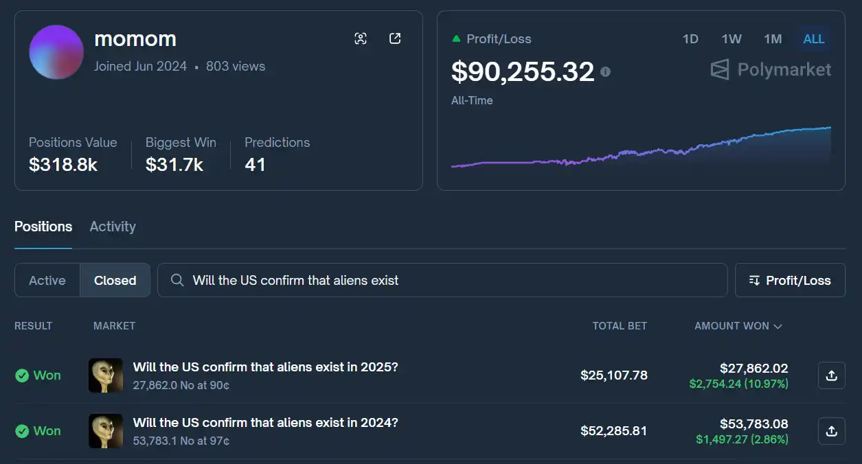 This is exactly what the account did in March last year: Amidst numerous market noises and widespread media coverage, he bet that the U.S. would not announce the existence of extraterrestrials within the following ten months, when the probability was 10%. This trade ultimately earned him a 10% profit.