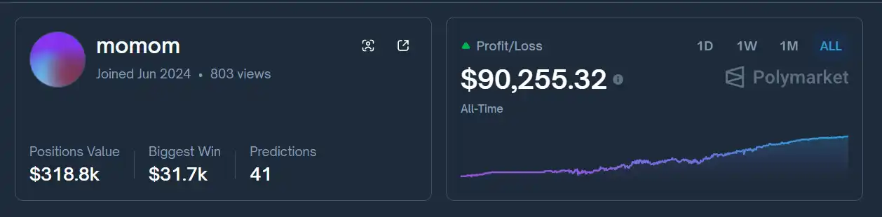 Meanwhile, momom's on-chain deposits included several large transactions exceeding $100,000. Combined with the fact that momom's account only made one "Yes" bet, and considering that terremoto's transaction frequency is so high that it resembles a full-time trader actively participating in prediction markets every day, we ultimately believe that momom better matches Vitalik's profile.