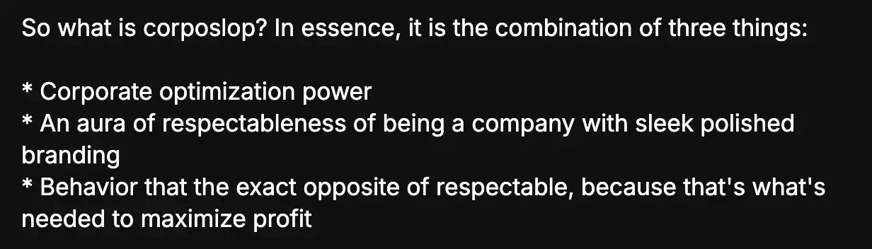 The term "corposlop" coined by Vitalik can be understood as: corporate garbage dressed up in a shiny exterior. These are companies and their products that possess strong business capabilities and sophisticated brand packaging, but actually engage in unethical behaviors in pursuit of profit.