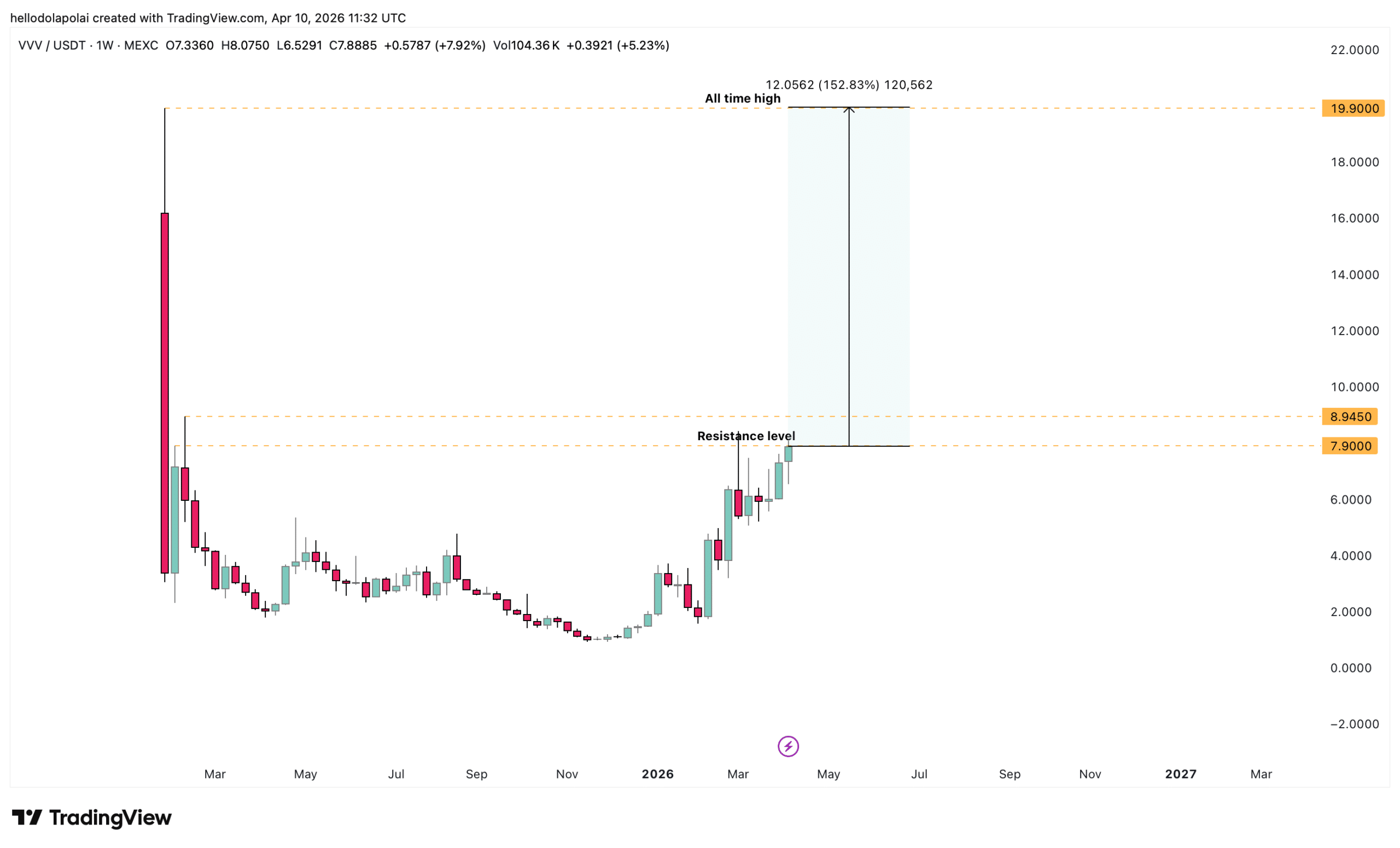 Price action shows little resistance between current levels and a broader breakout zone, suggesting that VVV could transition into price discovery if momentum holds.