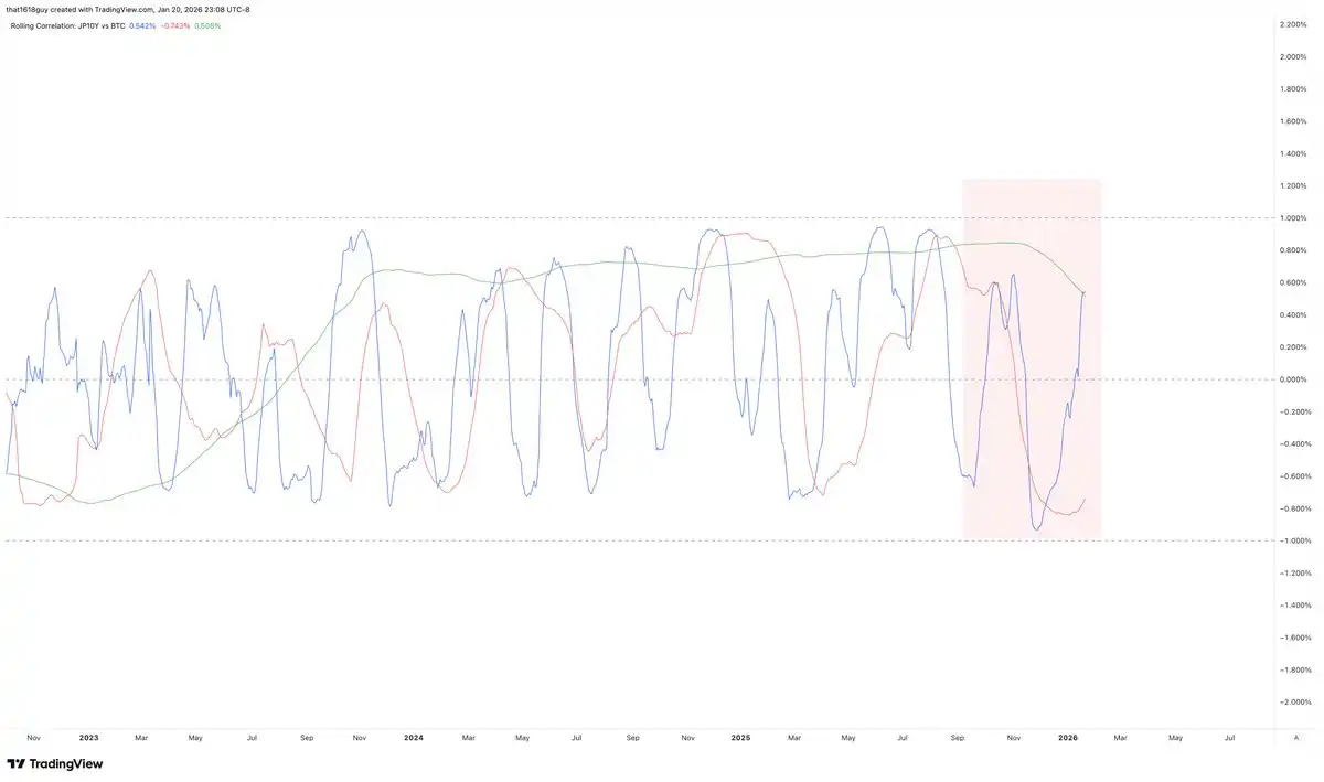 More interestingly, other markets did not exhibit similar phenomena. During the same period, Bitcoin maintained a negative correlation with Japanese 10-year yields.