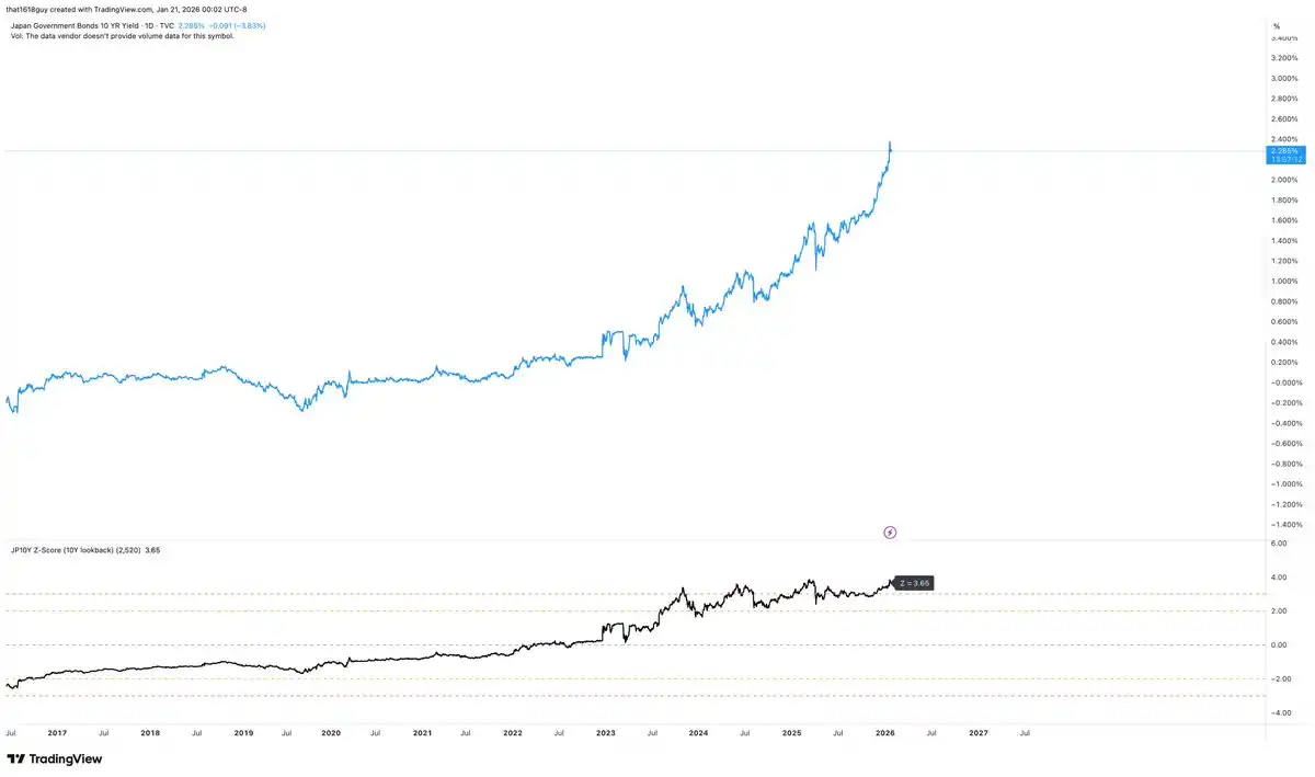 Japan has a unique sensitivity to this dynamic. The sharp upward surge in the yield of Japan's 10-year government bonds, as shown in the chart above, is by no means a neutral event for its domestic financial system. The key issue lies not only in the rise in yields, but also in the fact that the magnitude of the increase has reached statistically extreme levels relative to Japan's own policy framework.