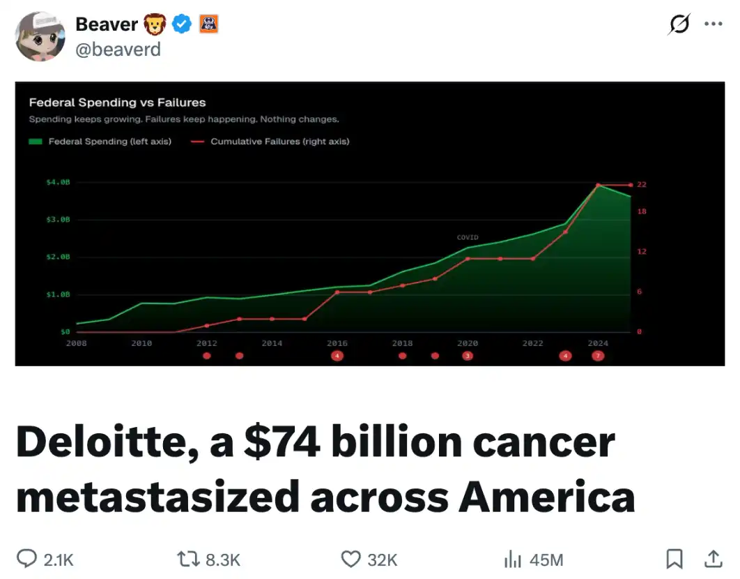 The creator of the X account named Beaver, became a millionaire through a single article. The article he wrote, "Deloitte, a $74 billion cancer metastasized across America," received 45 million views.