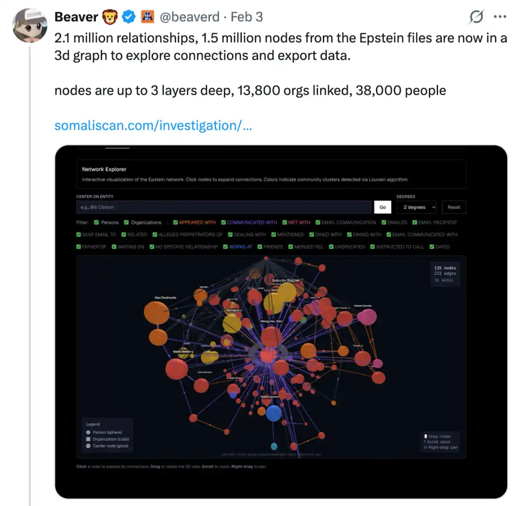 On February 3, Beaver was still organizing the content from the massive "Epstein Files" to be published on the website into a complex relationship chart.
