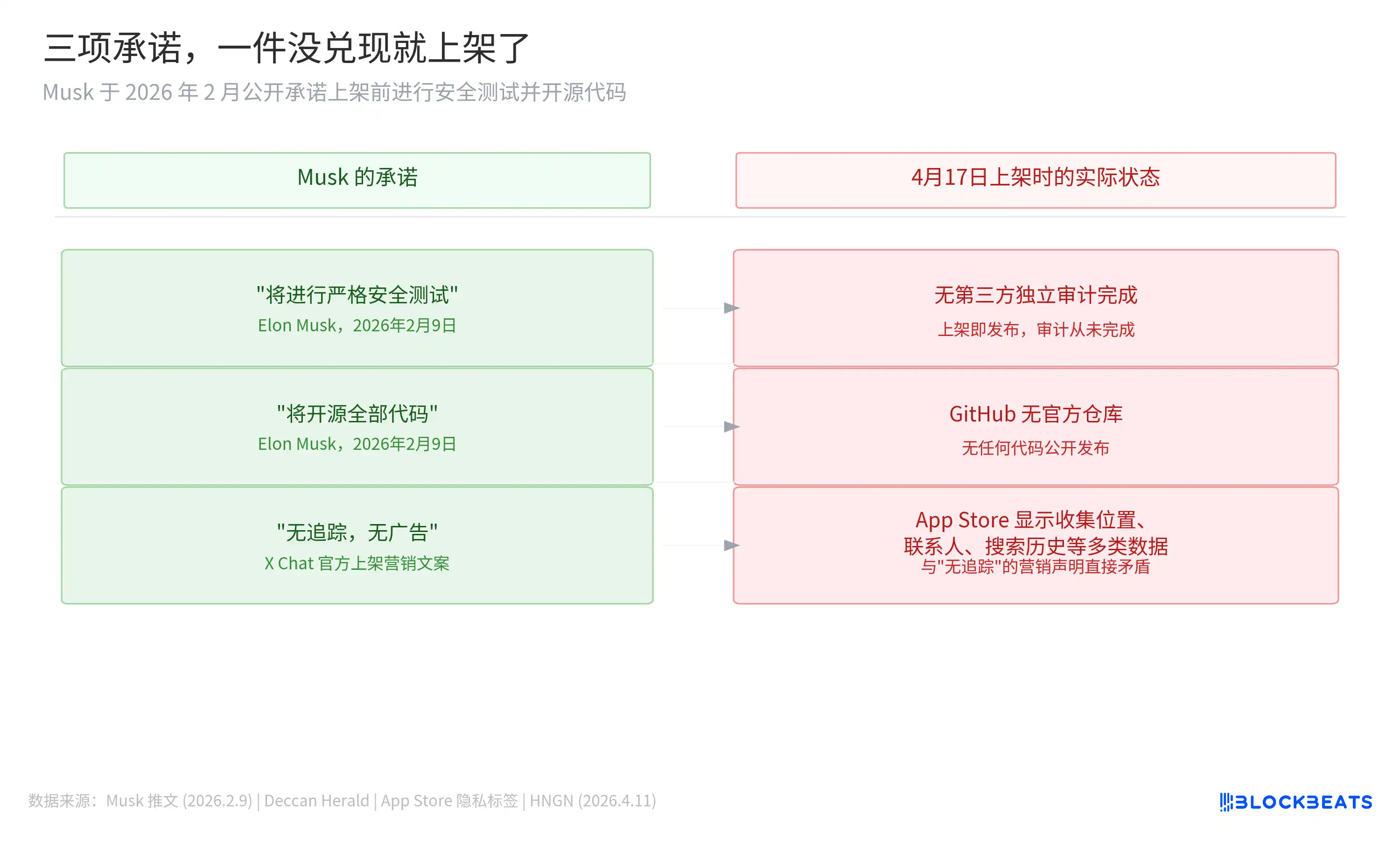 As of its listing on April 17, no independent third-party audit has been completed, there is no official code repository on GitHub, and the App Store privacy label indicates that X Chat collects more than five categories of data, including location, contact information, and search history—directly contradicting its marketing claims of "No Ads, No Trackers."