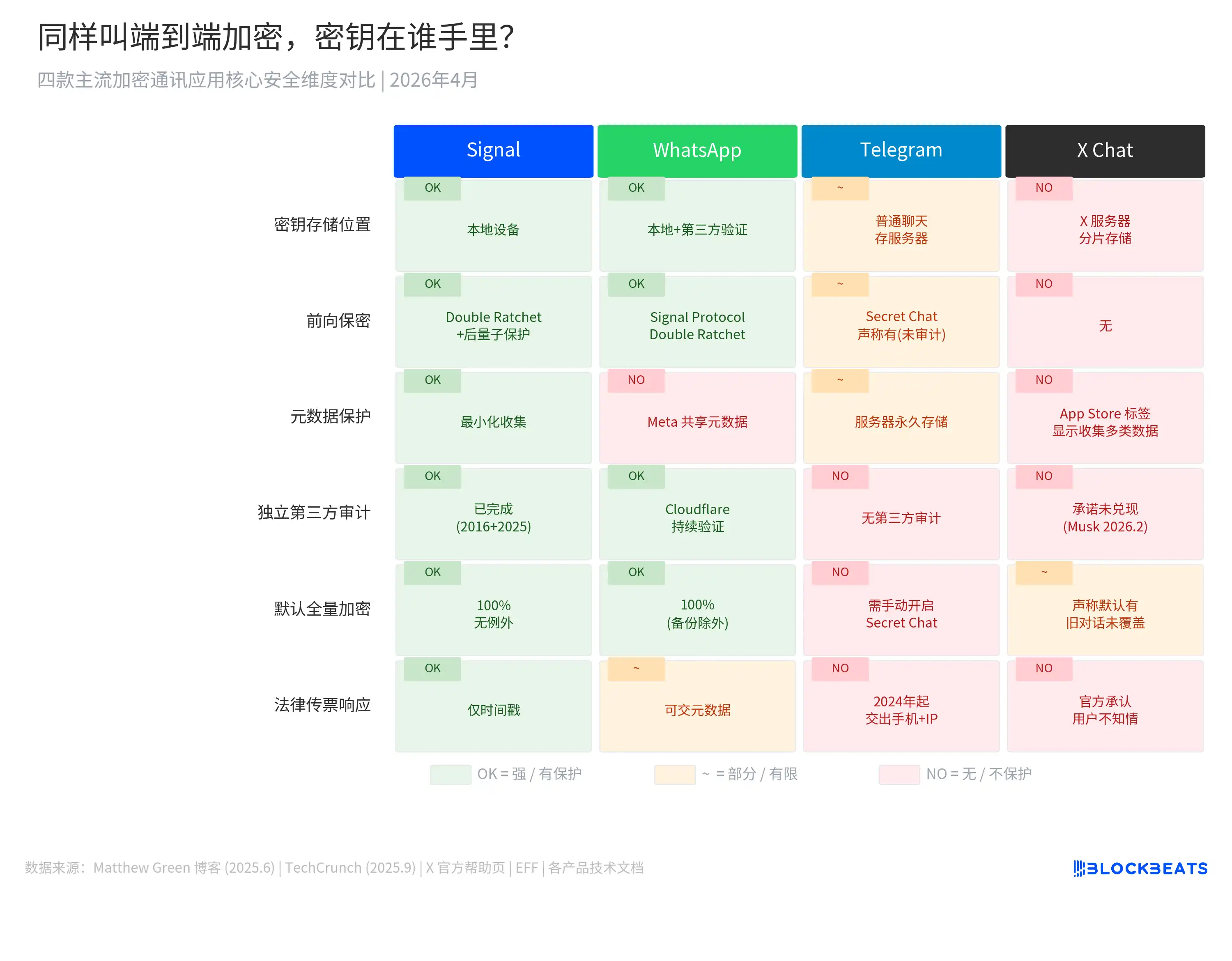The difference is that WeChat has never claimed on its main interface that it is "end-to-end encrypted," while X Chat has. To users, "end-to-end encrypted" means that no one, including the platform itself, can see their messages. X Chat’s architecture does not meet this user expectation, yet it uses the term.