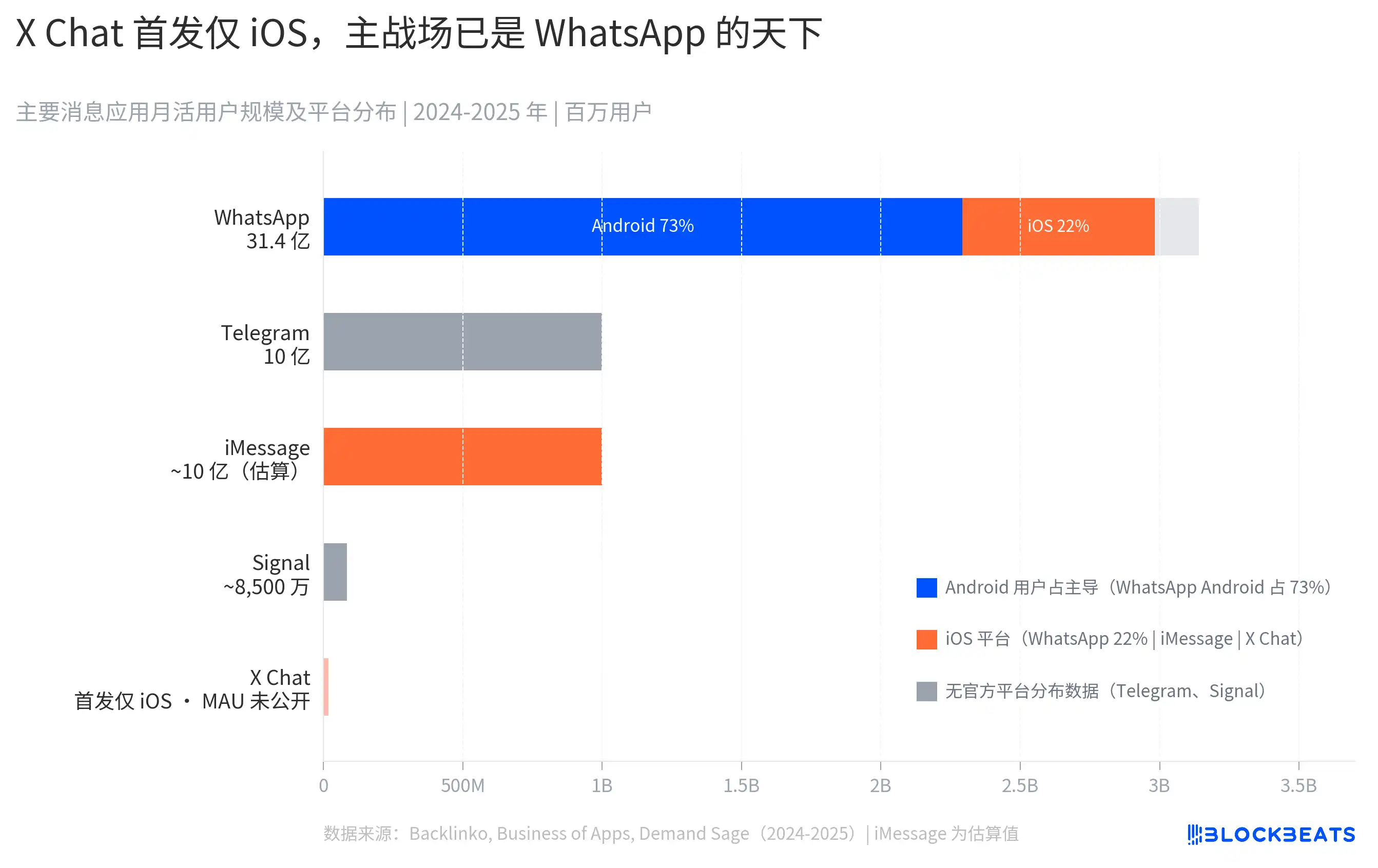 X Chat sidestepped this battlefield, and there are two interpretations. First, technical debt: X Chat is built in Rust, and cross-platform support is not easy; prioritizing iOS may reflect engineering timelines. Second, a strategic choice: the U.S. market has an iOS penetration rate of nearly 55%, and X’s core user base is in the U.S.; prioritizing iOS means focusing on its core market rather than directly competing with WhatsApp in Android-dominated emerging markets.