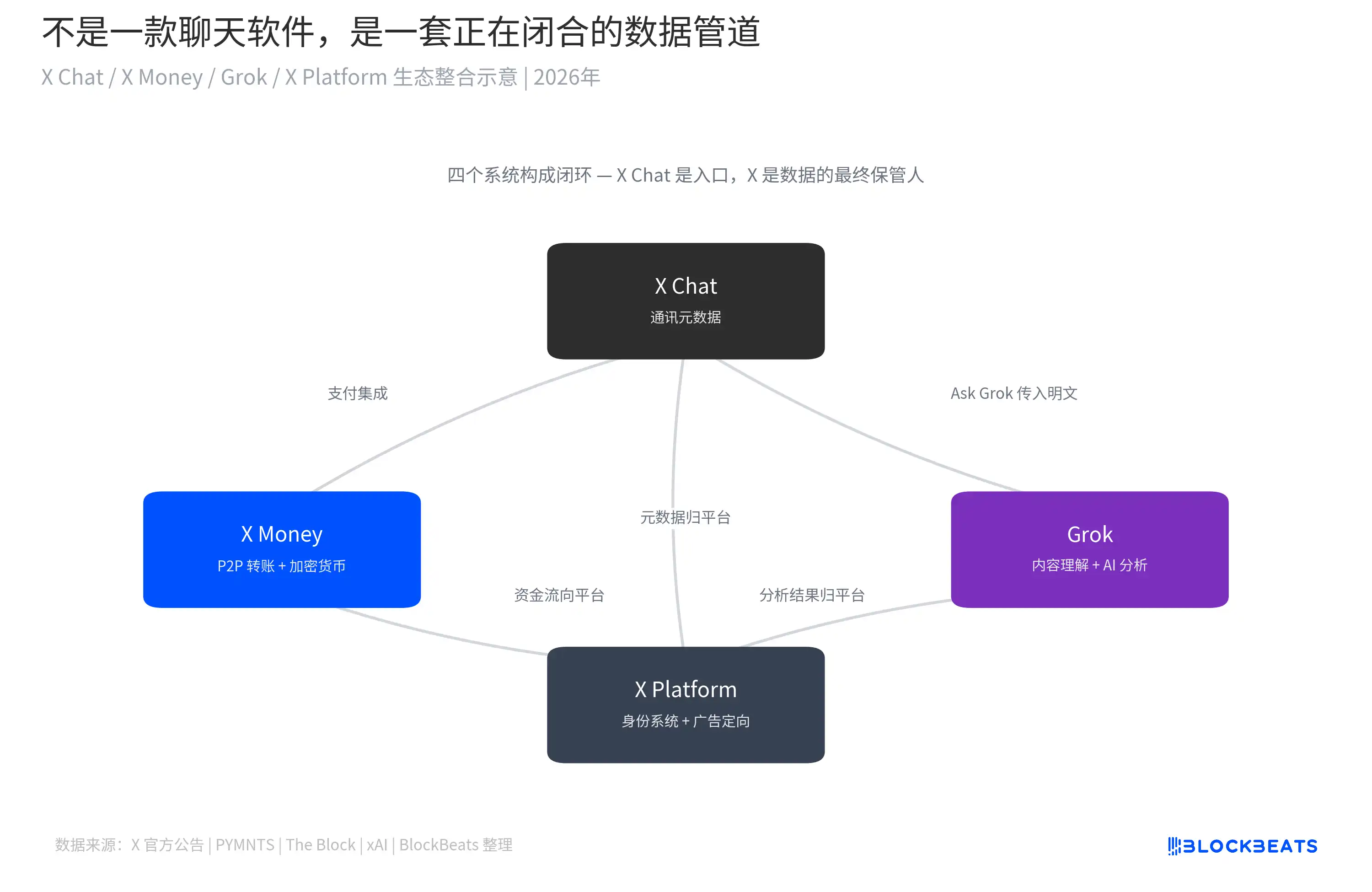 This has been described before: X Chat, X Money, and Grok form a data闭环, parallel to existing infrastructure, with a logic identical to the WeChat ecosystem. This assessment is not new, but with the launch of X Chat, it’s worth revisiting the wiring diagram.