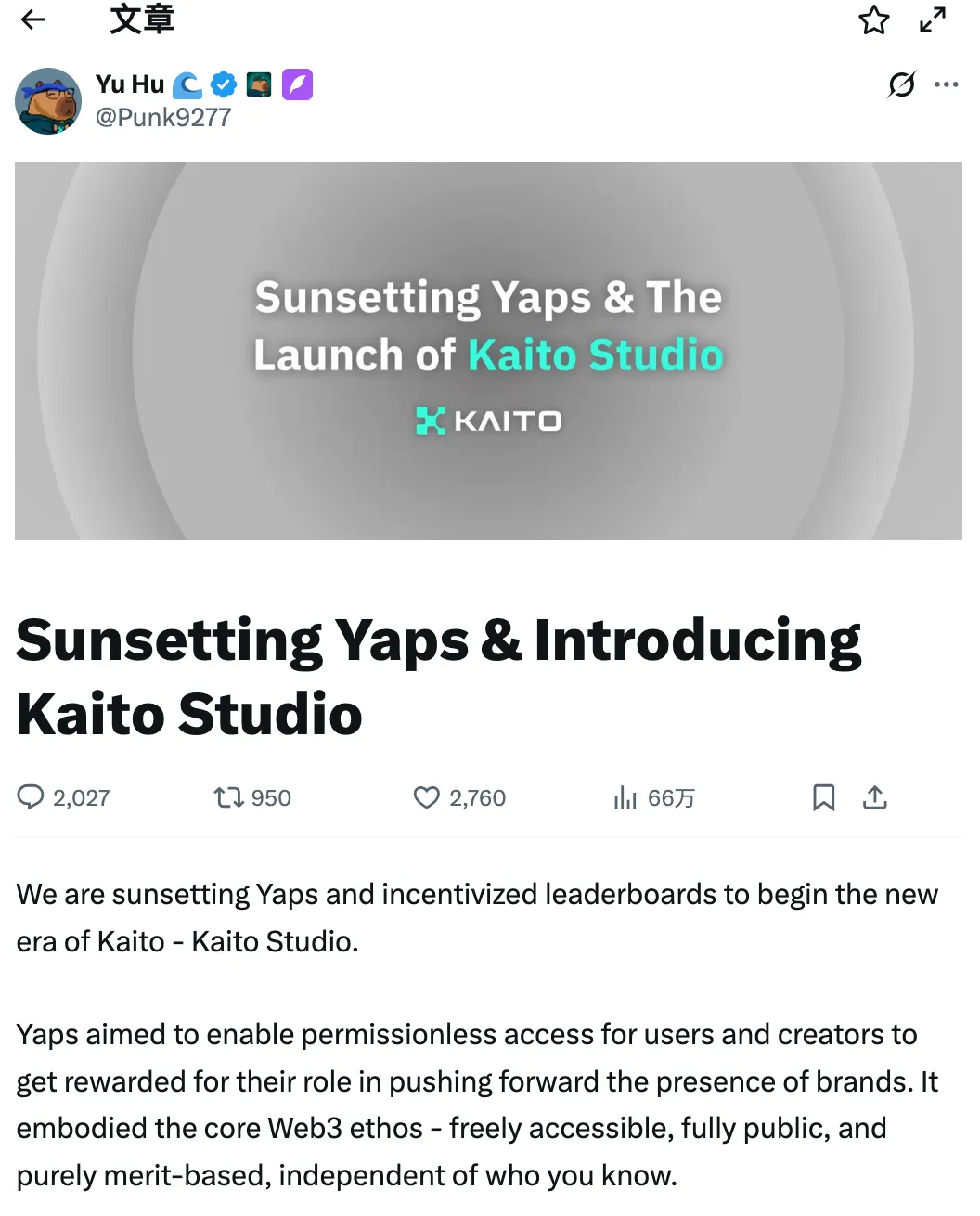 In explaining the reasons for the transition, Kaito did not avoid addressing the inherent issues with the InfoFi model itself. He pointed out that even after continuously raising entry barriers and introducing screening mechanisms, low-quality content and traffic manipulation remained difficult to prevent. After discussions with X, the team also agreed that a "fully permissionless incentive distribution system" no longer aligned with the shared needs of the platform, brands, and creators. From the wording, it can be inferred that the end of Yaps likely represents an active abandonment of the original InfoFi approach.