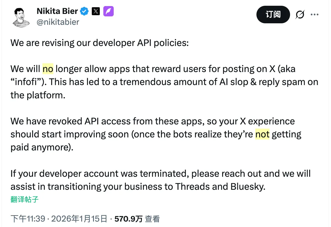 X Product Owner Nikita Bier The platform posted that X is revising its developer API policies and willNo applications that offer rewards for users posting on X will be allowed to continue accessing the API.In his statement, such applications were directly named as infofi, which is alsoOne of the main sources of recent AI-generated garbage content and response pollution on the platform.