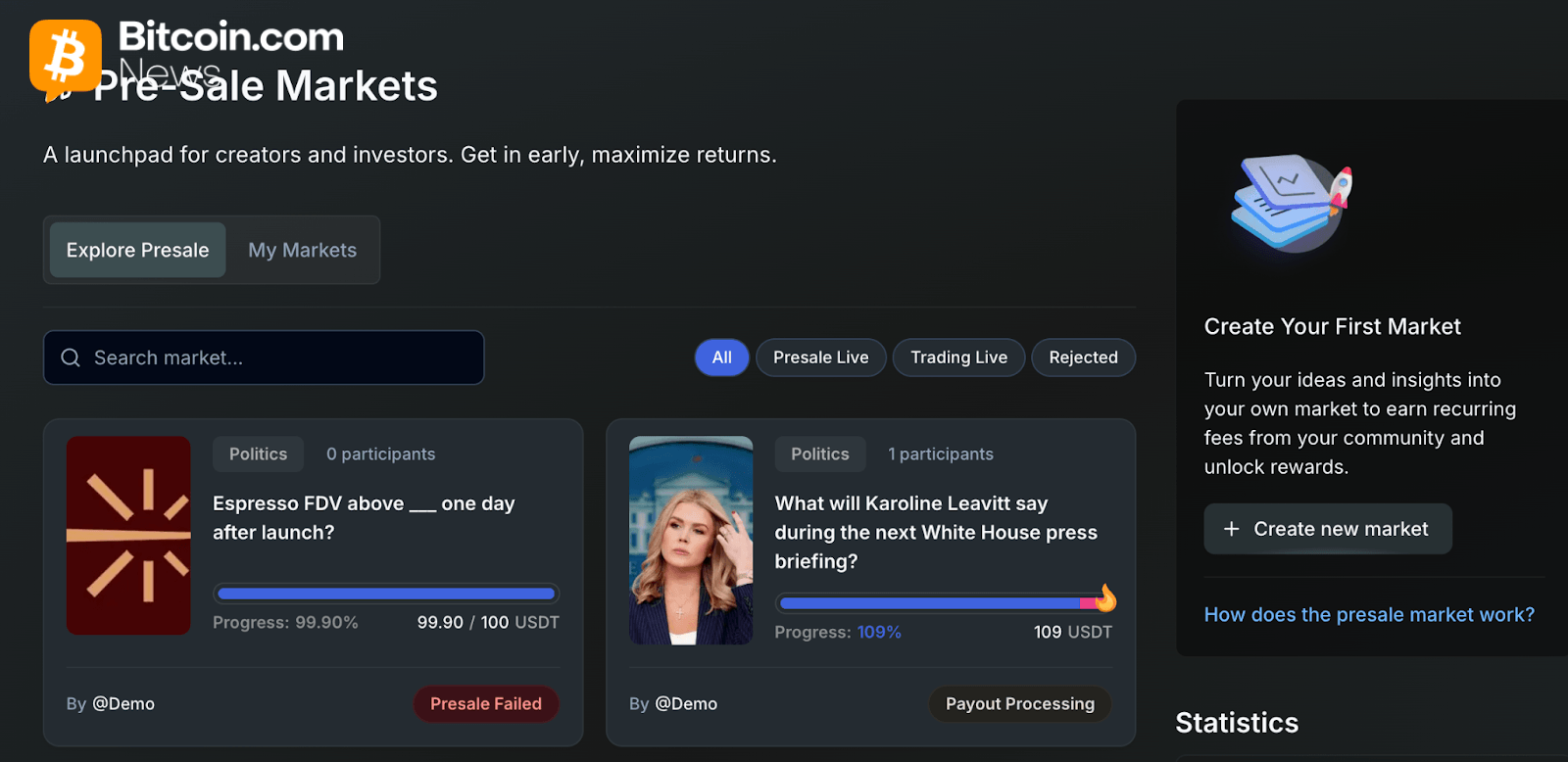 Before any market goes live for public trading, it enters a Pre-Sale Phase. During this window, the market creator and early investors can fund the market’s Pre-Sale Pool. If the pool reaches its designated soft cap, the market officially launches. If it doesn’t, all contributed funds are returned – zero risk for early backers.