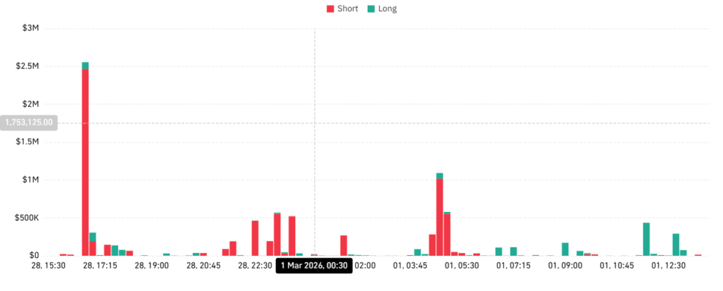 The chart highlights a major liquidation cluster on ,Notably, long liquidations surged sharply, forming the tallest red bar on the chart. The value approached 1,696,875, marking the session’s most aggressive flush. In contrast, short liquidations remained comparatively limited during that spike. This imbalance shows that overleveraged buyers absorbed the primary losses.