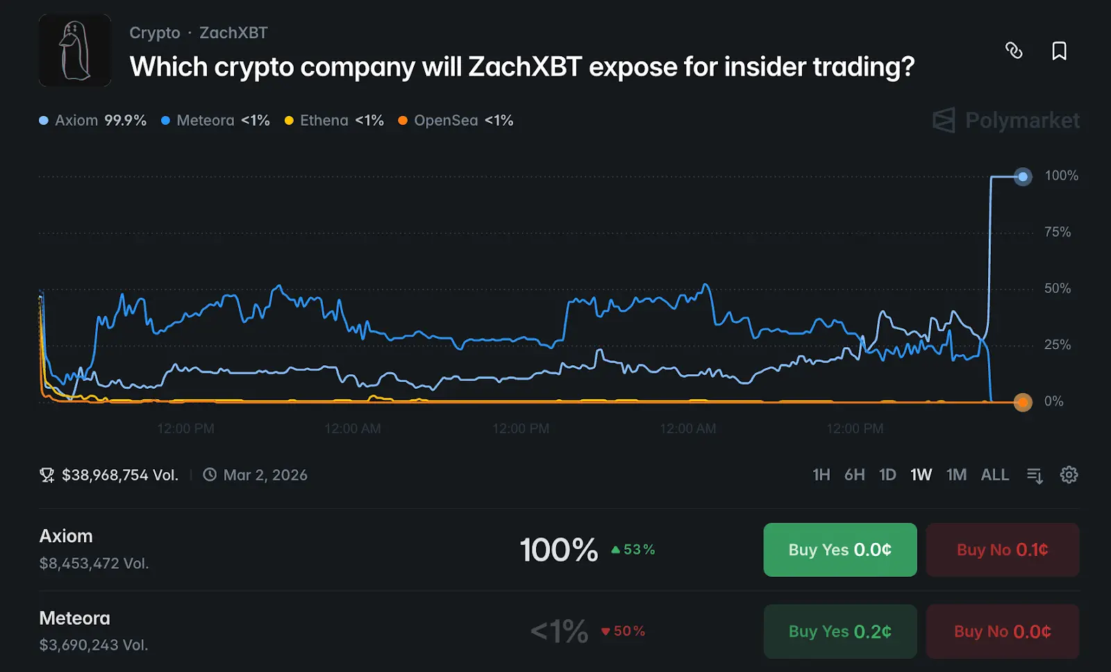 The event that has captured market attention and accumulated tens of millions of dollars in bets on Polymarket—“Which crypto company will ZachXBT expose for insider trading?”—has finally come to an end. On February 26, on-chain detective ZachXBT officially released his investigation report, directly implicating the DeFi trading platform Axiom Exchange.