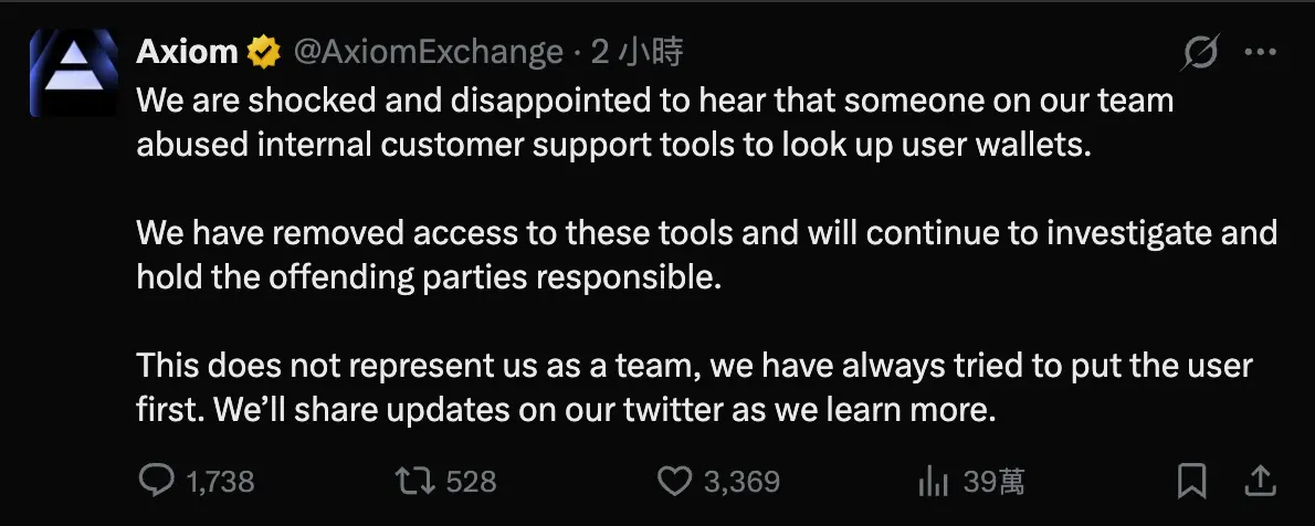 Following the release of the ZachXBT report, Axiom’s official response followed a standard PR crisis protocol: issuing a statement expressing “shock and disappointment,” revoking permissions, and launching an investigation. However, this still fails to conceal the underlying systemic failures—such incidents reveal a breakdown in platform access controls, not merely the actions of a single employee.