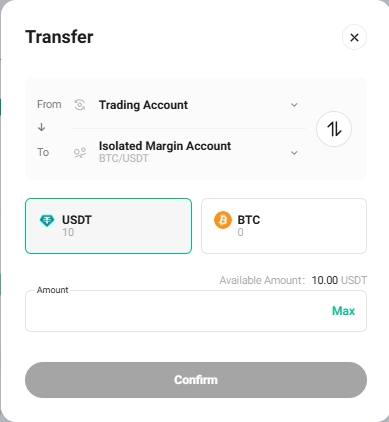 In the “Transfer” pop-up window, select the Isolated Margin account and the trading pair you want to trade (such as BTC/USDT), select the Coin (USDT or BTC), enter the Amount, then transfer funds to the corresponding isolated Margin Account.