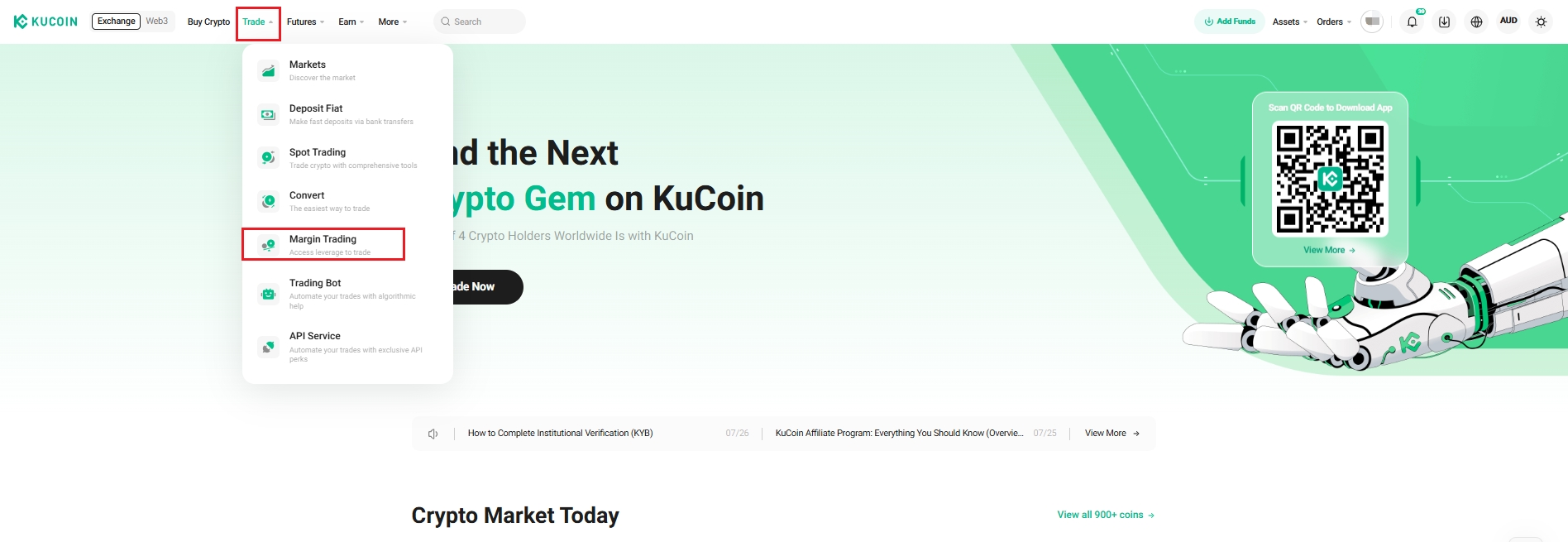 Log in to your KuCoin account and click Trade → Margin Trading.