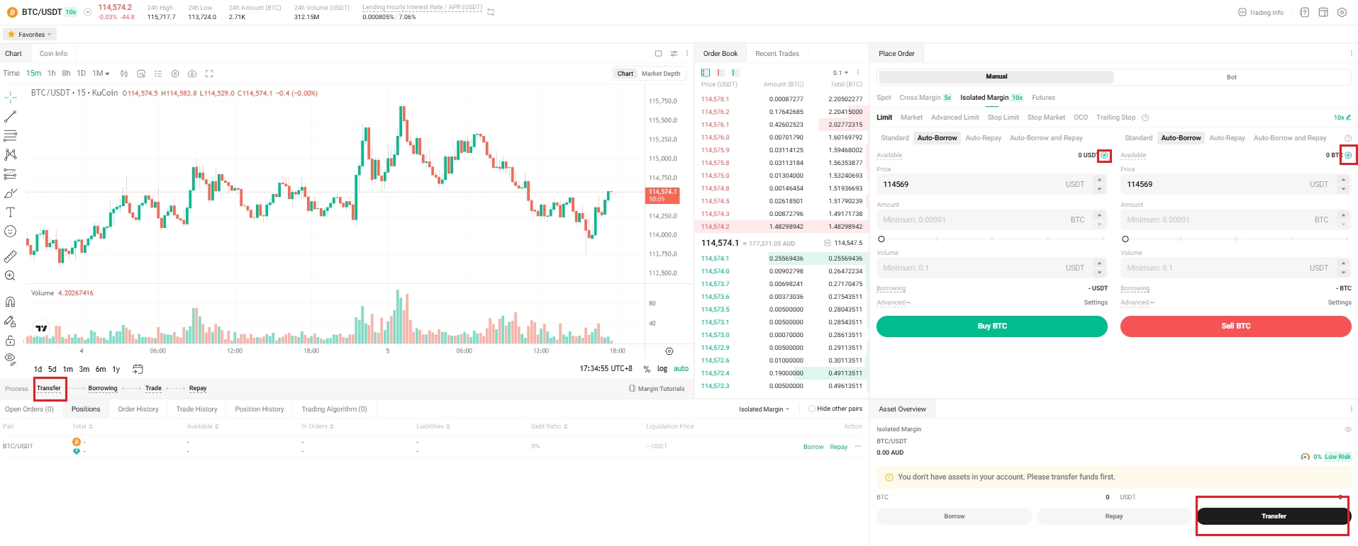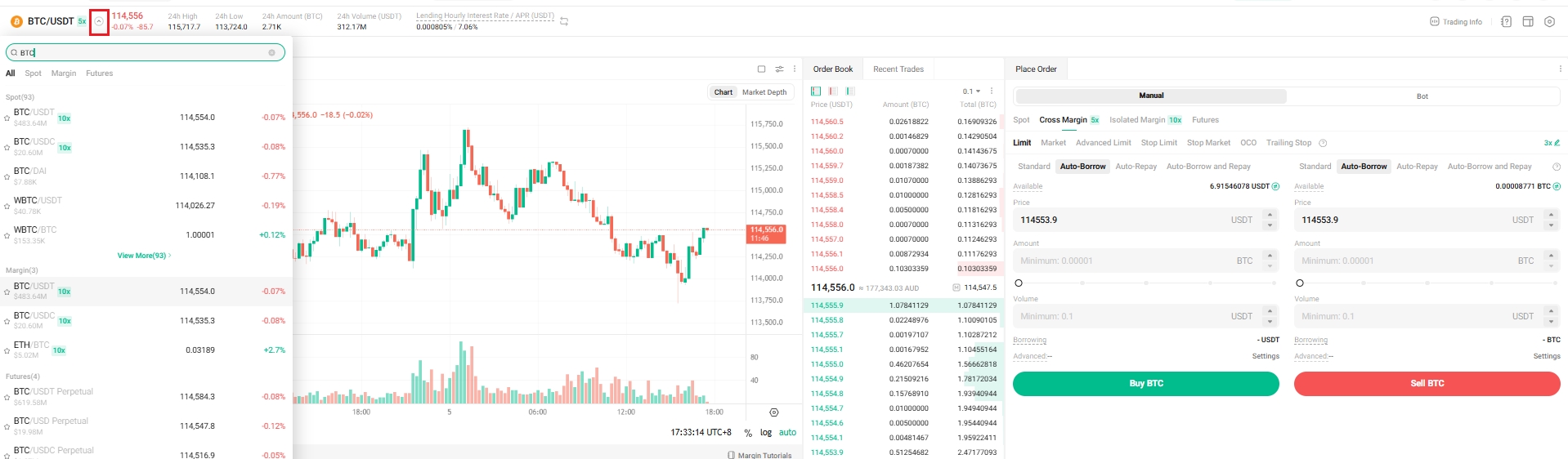 Click on the Margin button in the upper left corner and select an isolated trading pair such as BTC/USDT.