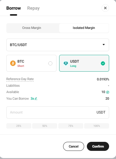 In the “Borrow” pop-up window, choose the Coin to borrow. Enter the Amount and click Confirm.