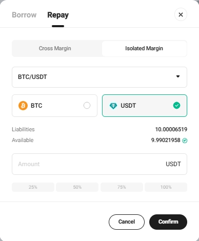 In the “Repay” pop-up window, select the Coin and enter the Amount to repay, then click Confirm.
