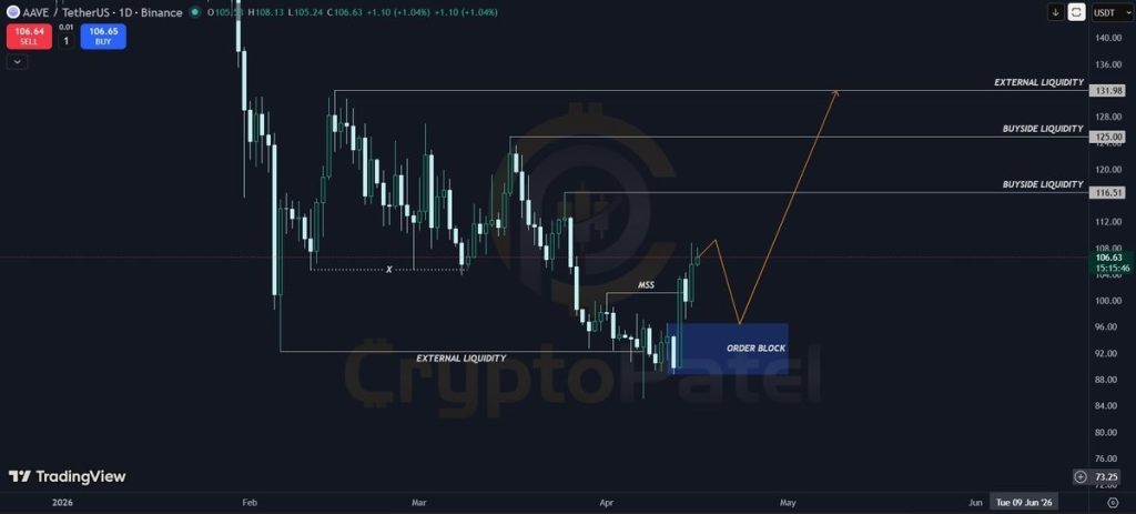 Analisamos o gráfico da AAVE apresentado por Patel, e a estrutura é didática. O preço da AAVE está negociando próximo a US$ 106,65. O gráfico mostra uma mudança clara na estrutura de mercado confirmada, marcada como MSS no gráfico. Isso significa que a tendência de baixa terminou e uma nova tendência de alta começou.