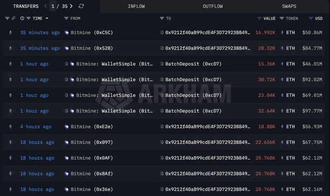 A empresa de análises on-chain Arkham Intelligence relatou primeiramente o staking. Eles observaram que o BitMine moveu fundos em lotes para o endereço de staking.
