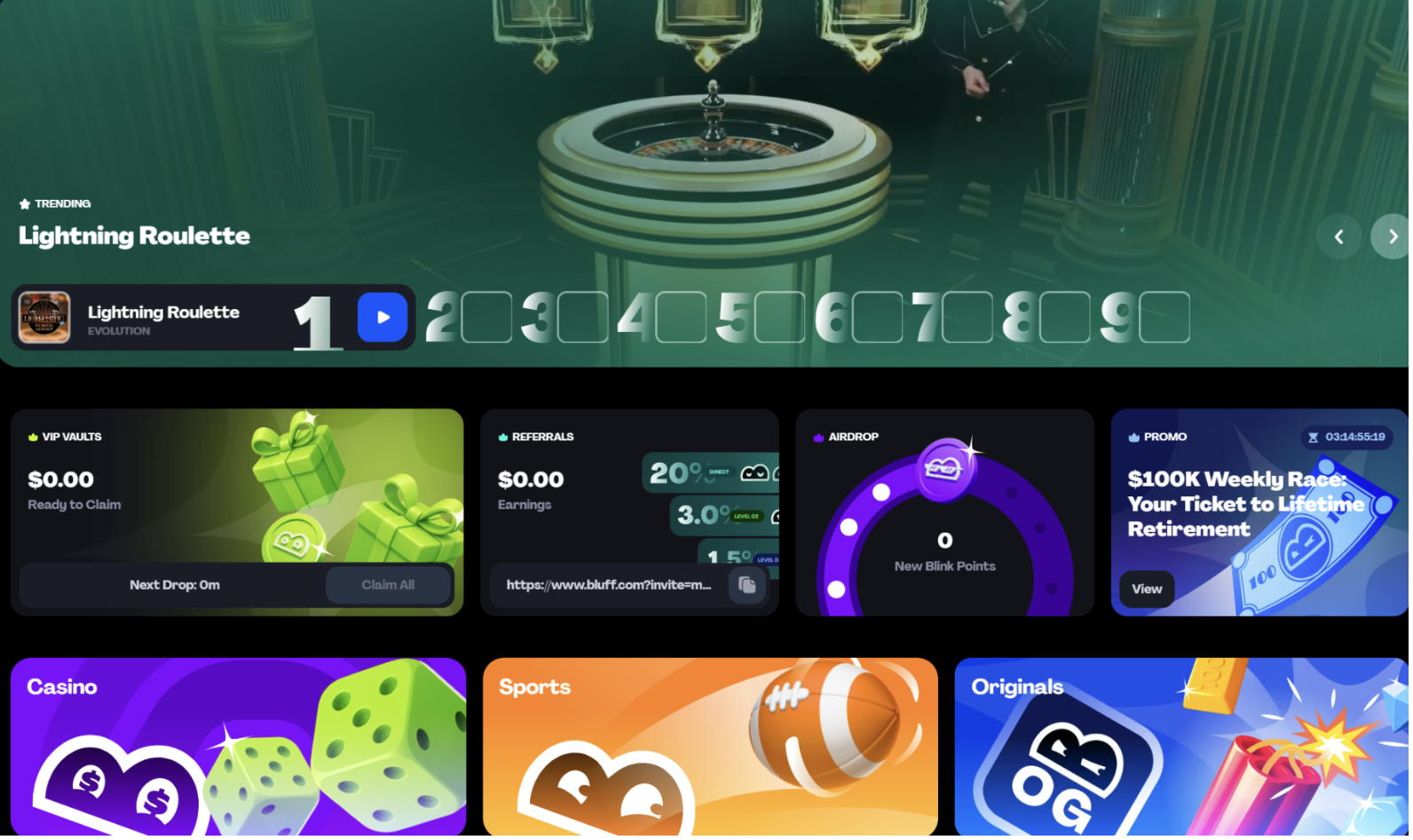 O bluff desfoca as fronteiras entre jogo, previsão, especulação e entretenimento. Resultados binários, mercados personalizados, conteúdo original do BLUFF projetado do zero, experiências personalizadas ajustadas com base no comportamento dos jogadores.