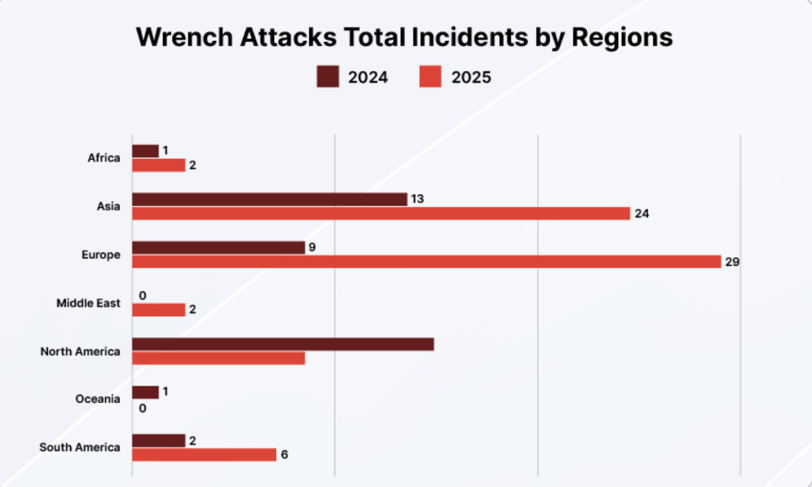 Geograficamente, a Europa tornou-se pela primeira vez a região com maior risco global. Em 2025, a Europa representou mais de 40% dos eventos conhecidos mundialmente, com a França registrando o maior número de ataques, superando os Estados Unidos. A CertiK destacou no relatório que essa mudança não significa que o risco na América do Norte desapareceu, mas sim que esses crimes estão se espalhando para regiões com ambientes jurídicos mais complexos e custos mais altos de cooperação transfronteiriça.