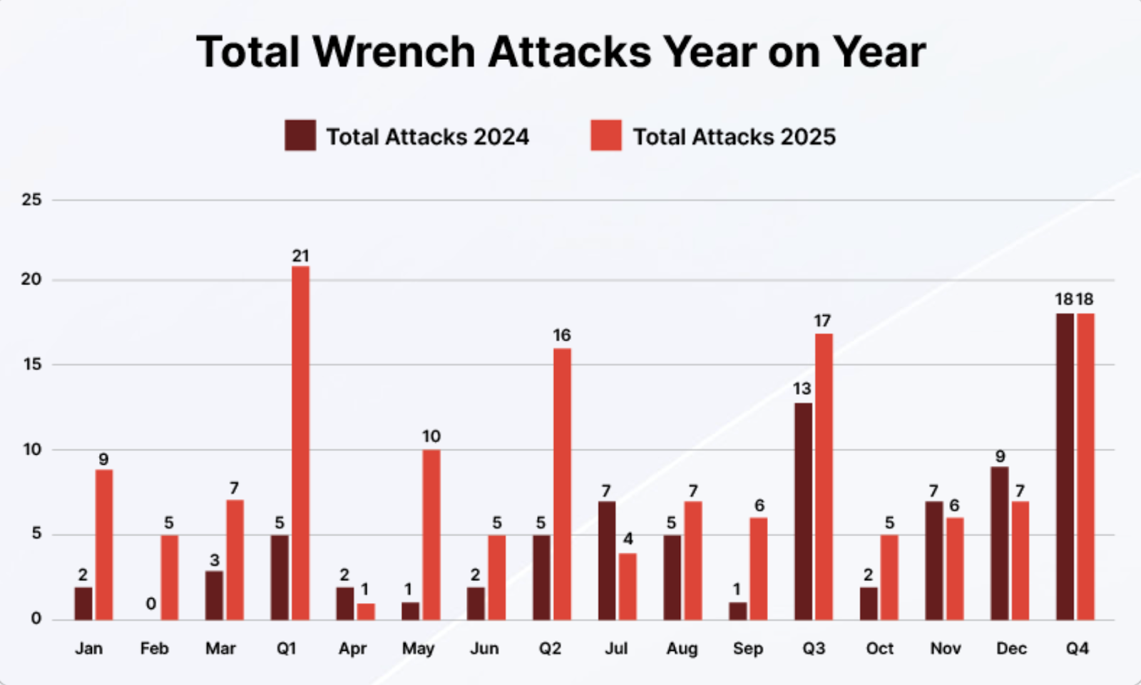 O relatório mostra que, em 2025, foram registradas globalmente 72 incidentes de ataque de chave de fenda verificados, um aumento de 75% em relação a 2024. O termo "ataque de chave de fenda" refere-se a situações em que atacantes usam手段 físicos, como violência, ameaças e sequestro, para forçar vítimas a entregar chaves privadas ou senhas. Esse tipo de ataque não depende de vulnerabilidades técnicas, mas sim ataca diretamente as pessoas por trás dos ativos criptografados.