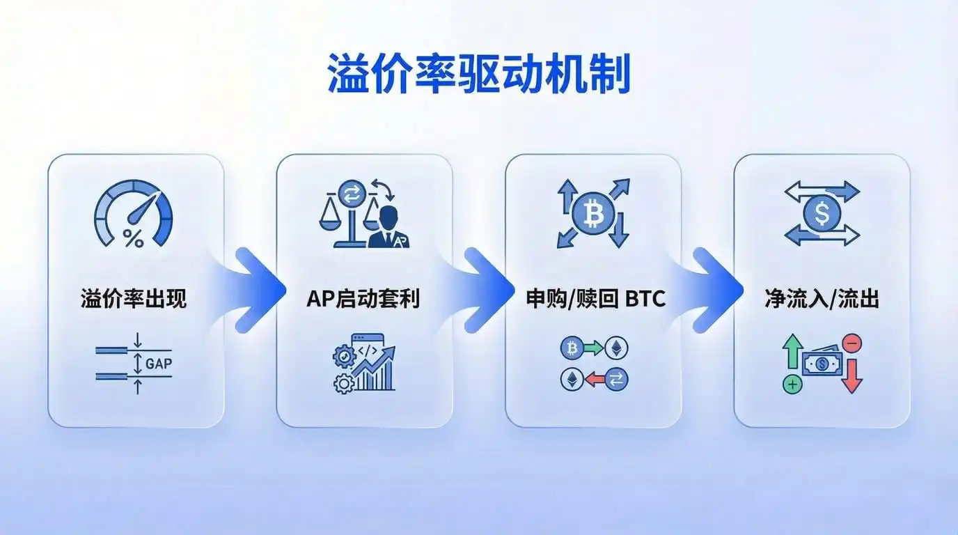 Quando surge uma taxa de prima positiva, a caixa de presentes torna-se mais cara do que as maçãs. Nesse caso, o AP (Participante Autorizado) compra BTC no mercado primário, empacota-o em cotas do ETF e depois vende no mercado secundário, obtendo lucro com a diferença de preços. Nesse processo, BTC é comprado e há uma entrada líquida de fundos.