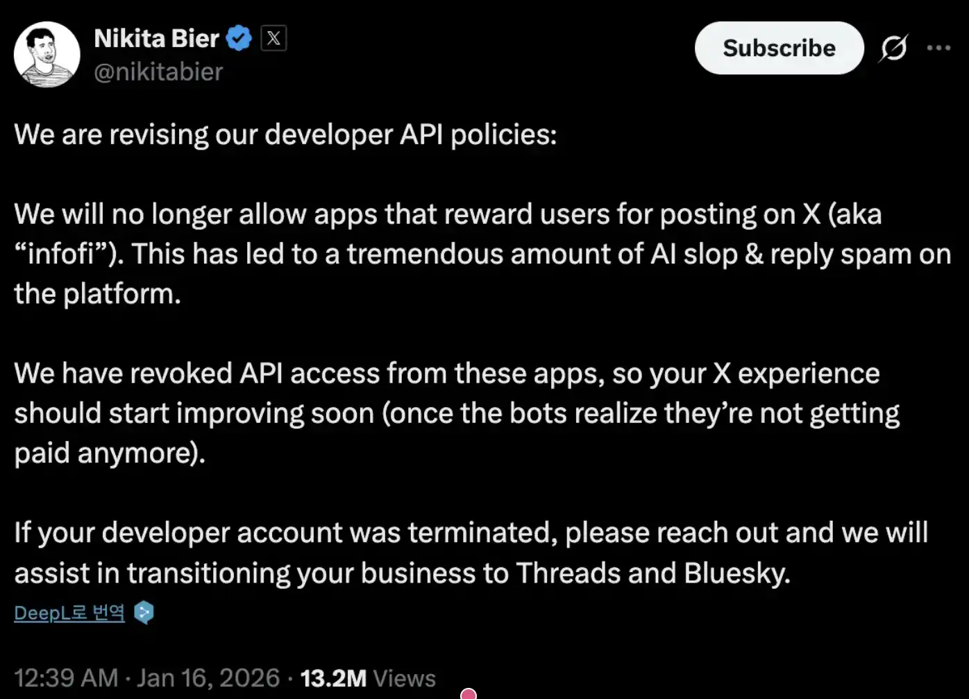 Em 15 de janeiro, Nikita Bier, responsável de produtos da X, publicou uma breve atualização, afirmando claramente que a plataforma não permitiria mais a operação de aplicações que "trocassem recompensas por publicações". Para projetos InfoFi, isso equivaleu-se quase a uma sentença de morte.
