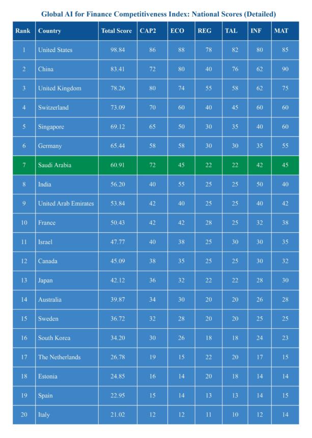 - A Arábia Saudita ocupa a 7ª posição globalmente, citada como o mercado do Golfo que mais cresce rapidamente para a finança impulsionada pela IA.